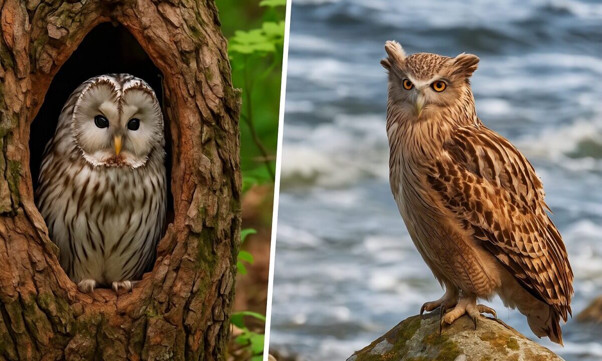 森の中で静かにくらすエゾフクロウと、水辺で力強く生きるシマフクロウ。