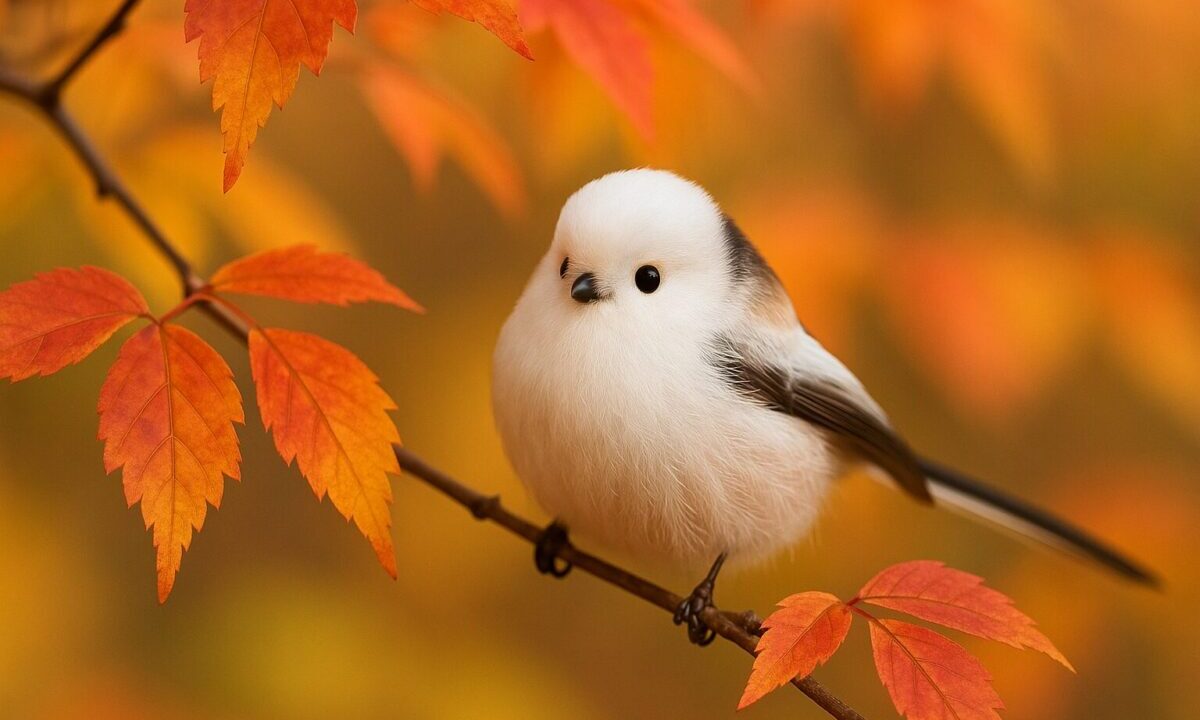 北海道の秋は紅葉がとてもきれいで、その中で見るシマエナガはひときわ目を引きます。